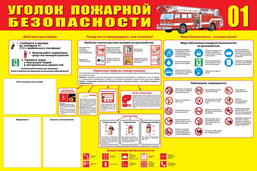 - «Уголок пожарной безопасности» для производственных помещений.Этот специализированный противопожарный стенд разработан с учетом всех требований к пожарной безопасности, предъявляемых к производственным помещениям. Он содержит выдержку из закона, информацию о наиболее частых причинах возникновения пожара на производстве. На противопожарном стенде так же отражены правила поведения, которые обязан знать любой сотрудник, работающий на производстве.
